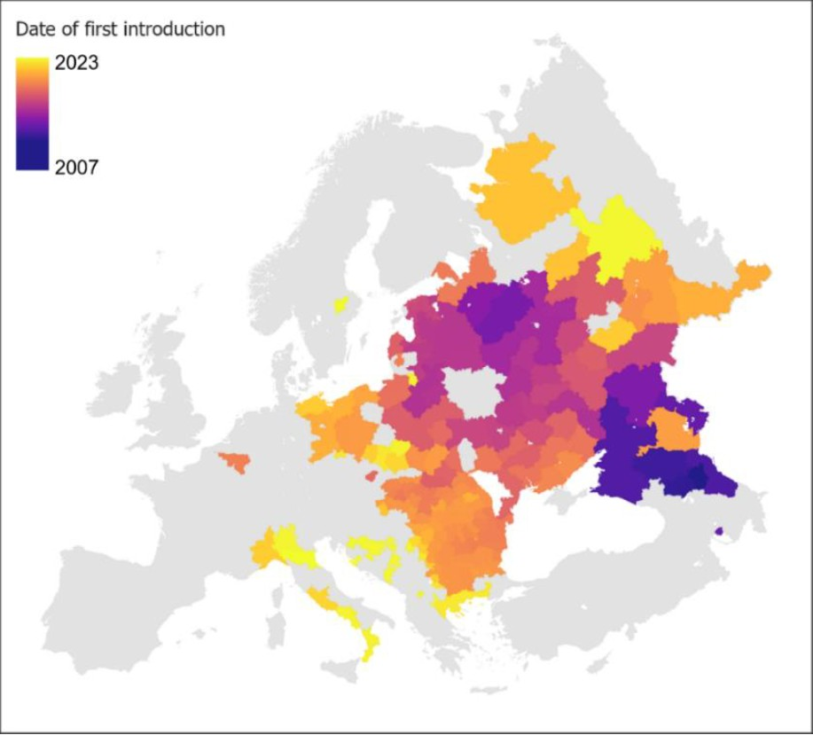 Primi focolai di PSA nei cinghiali selvatici in un’area specifica. I colori più scuri denotano date di introduzione precedenti (fonte: https://doi.org/10.21203/rs.3.rs-7526029/v1)