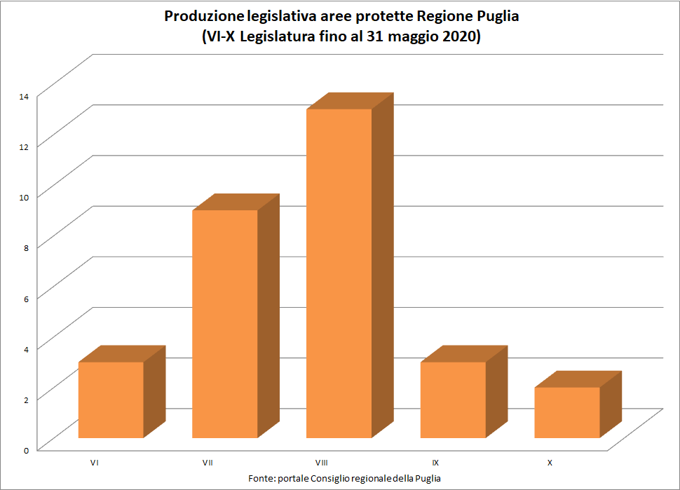 L’ottava legislatura (2005-2010), la prima con presidente Nichi Vendola, ha sfornato dodici leggi istitutive di aree protette regionali ed una di revisione dei confini del parco dell’Ofanto. Poca o nulla attenzione è stata posta alla gestione di queste aree che in molti casi sono ancora prive di guida. La nona legislatura (2010-2015) ha prodotto soltanto tre leggi tutte di revisione in pejus delle leggi istitutive dei parchi dell’Ofanto, della Terra delle Gravine nel tarantino e del Bosco Incoronata a Foggia. La decima ed attuale legislatura ha prodotto due leggi in materia e solo una delle quali di segno positivo, quella che ha inserito il Mar Piccolo di Taranto tra le aree da proteggere (2019). L’altra (2017) ha ancora una volta modificato la legge istitutiva del martoriato Parco della Terra delle Gravine, ancora una volta in pejus.