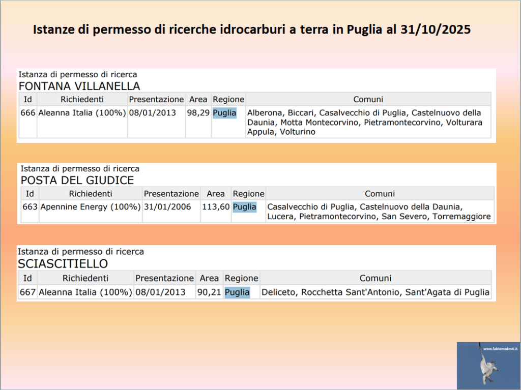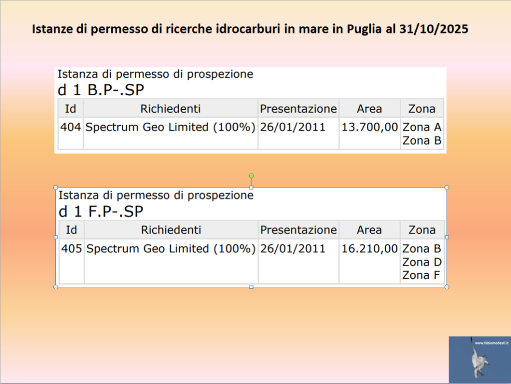 Dopo l’annullamento del Piano per la transizione energetica sostenibile delle aree idonee (Pitesai) da parte del TAR Lazio e dopo che il Ministero dell’Ambiente e della Sicurezza Energetica ha deciso di non presentare ricorso al Consiglio di Stato, riprende il balletto delle istanze di ricerca di idrocarburi a terra ed a mare. Per la Puglia la situazione è quella che potete leggere nelle tabelle che seguono elaborate sulla base del Bollettino Ufficiale degli Idrocarburi e delle Georisorse (BUIG) del 31 ottobre scorso. C’è da chiedersi, comunque, se e quali interferenze ci potranno essere tra le prospezioni a mare ed i progetti di eolico off shore che interessano tutte le acque marine pugliesi. Ma nella follia e nell’irrazionalità imperante va tutto bene.