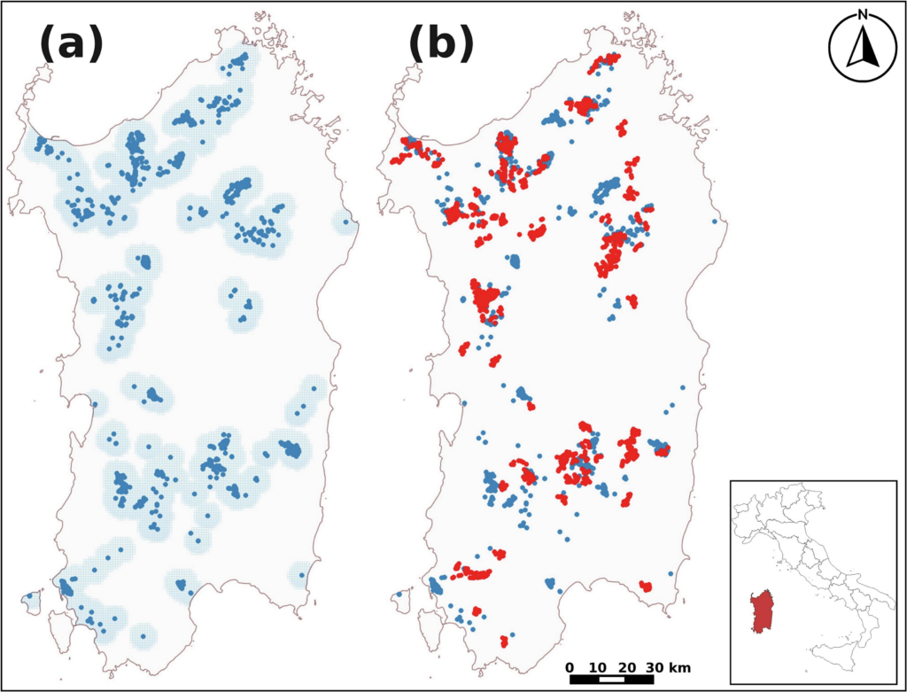 I ricercatori hanno utilizzato le immagini satellitari di Google per verificare al meglio quanto i tre set di dati rappresentassero le turbine eoliche in funzione nel 2022-2023 in Sardegna. Nell’area di studio, le foto più recenti sono state scattate tra il 1° gennaio 2022 e il 31 dicembre 2023. Le immagini su Google Satellite provengono da una serie di diversi fornitori commerciali e agenzie spaziali, poiché Google non si basa su un singolo sensore. Le immagini aeree vengono catturate con diversi mezzi, come aeroplani, droni o dispositivi come palloni e aquiloni. Le immagini aeree vengono visualizzate con colori naturali, utilizzando bande spettrali rosso, verde e blu, che vengono combinate per fornire una rappresentazione naturale della superficie terrestre. È stato visualizzato 1 km di tessere di Google Satellite in un Sistema Informativo Geografico (GIS). Le immagini aeree hanno permesso di identificare le turbine eoliche rispetto al paesaggio, in scala da 1:500 a 1:1000. «Per ogni turbina dei tre set di dati – scrivono i ricercatori – abbiamo generato un buffer con un raggio di 5 km e quindi una griglia vettoriale di 1 km. Quindi, sono state contate le turbine eoliche in ogni cella della rete. Va notato che, utilizzando il nostro buffer di 5 km, non abbiamo coperto completamente la Sardegna, bensì un’area di 8.123 km2 (circa il 33,8% del territorio regionale), che corrispondevano ai punti caldi dello sviluppo dell’energia eolica. Questo approccio è stato ritenuto adatto, in quanto non miravamo a creare inferenze sul numero totale di turbine sull’isola, ma piuttosto a testare l’accuratezza dei tre set di dati».