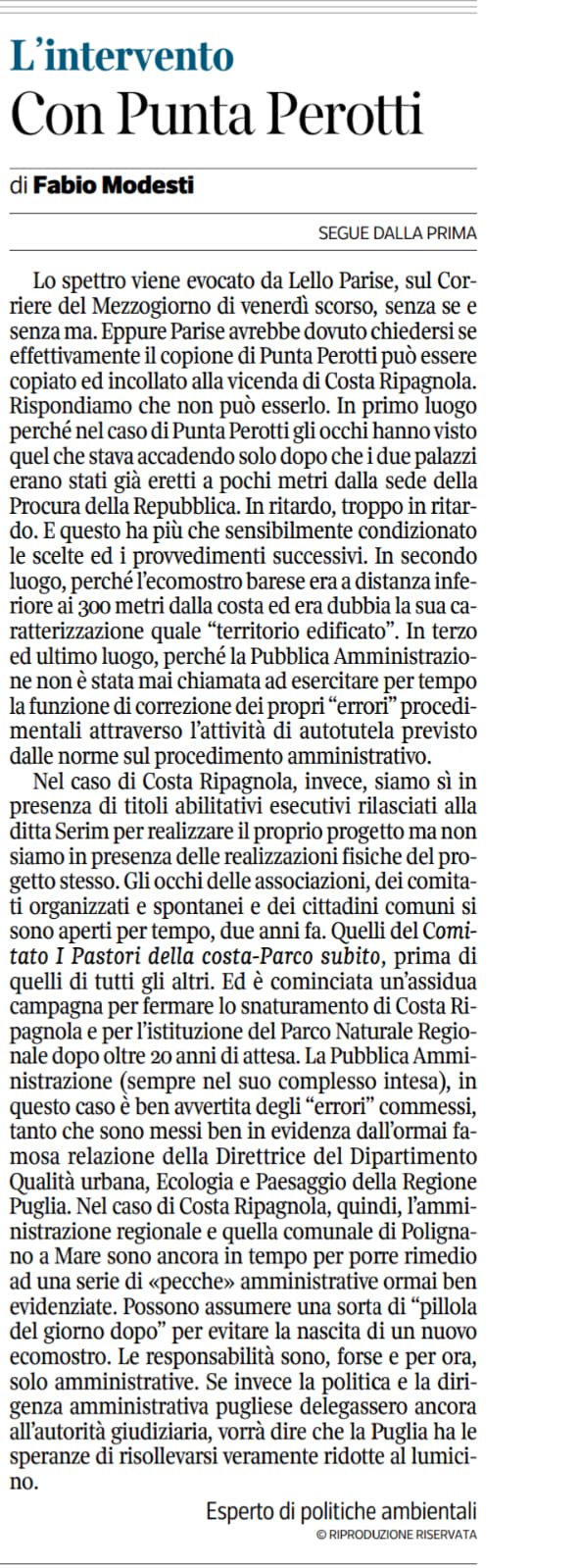 Uno spettro pare aggirarsi per i palazzi della Regione Puglia e del Comune di Polignano a Mare: quello di Punta Perotti adattato, però, alla vicenda di Costa Ripagnola. Lo spettro viene evocato da Lello Parise, sul Corriere del Mezzogiorno di ieri, senza se e senza ma. Eppure Parise avrebbe dovuto chiedersi se effettivamente il copione di Punta Perotti può essere copiato ed incollato alla vicenda di Costa Ripagnola. Rispondiamo che non può esserlo. In primo luogo perché nel caso di Punta Perotti gli occhi hanno visto quel che stava accadendo solo dopo che i due palazzi erano stati già eretti a pochi metri dalla sede della Procura della Repubblica. In ritardo, troppo in ritardo. E questo ha più che sensibilmente condizionato le scelte ed i provvedimenti successivi. In secondo luogo, perché nel caso dell’”ecomostro” barese lo strumento urbanistico consentiva senza dubbio la realizzazione dei palazzi ma quell’area era a distanza inferiore ai 300 metri dalla costa ed era dubbia la sua caratterizzazione quale “territorio edificato”. In terzo ed ultimo luogo, perché la Pubblica Amministrazione (nel suo complesso) in quel caso non è stata mai chiamata ad esercitare per tempo la sacrosanta funzione di correzione dei propri “errori” procedimentali attraverso l’attività di autotutela previsto dalle norme sul procedimento amministrativo. E così, in quel caso, la Magistratura Penale è stata chiamata a supplire alle inerzie della politica e della dirigenza amministrativa. Un caso di supplenza tra i peggiori tanto che la CEDU ha ristabilito le regole del diritto per cui non ci può essere reato senza persone condannate per averlo commesso e non si può confiscare un bene in tale situazione.