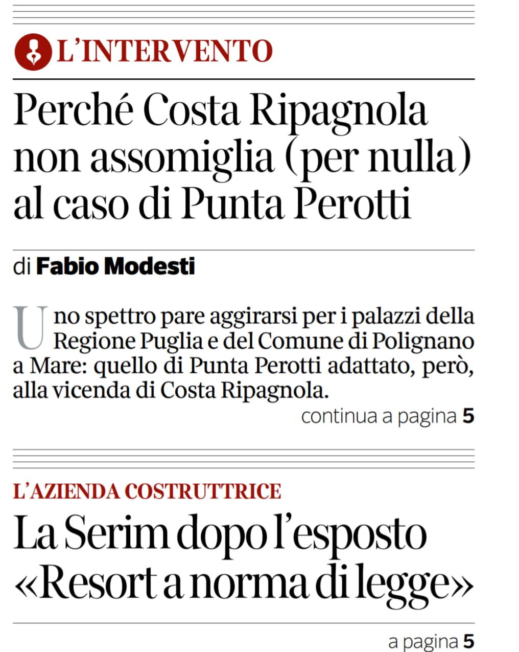 Uno spettro pare aggirarsi per i palazzi della Regione Puglia e del Comune di Polignano a Mare: quello di Punta Perotti adattato, però, alla vicenda di Costa Ripagnola. Lo spettro viene evocato da Lello Parise, sul Corriere del Mezzogiorno di ieri, senza se e senza ma. Eppure Parise avrebbe dovuto chiedersi se effettivamente il copione di Punta Perotti può essere copiato ed incollato alla vicenda di Costa Ripagnola. Rispondiamo che non può esserlo. In primo luogo perché nel caso di Punta Perotti gli occhi hanno visto quel che stava accadendo solo dopo che i due palazzi erano stati già eretti a pochi metri dalla sede della Procura della Repubblica. In ritardo, troppo in ritardo. E questo ha più che sensibilmente condizionato le scelte ed i provvedimenti successivi. In secondo luogo, perché nel caso dell’”ecomostro” barese lo strumento urbanistico consentiva senza dubbio la realizzazione dei palazzi ma quell’area era a distanza inferiore ai 300 metri dalla costa ed era dubbia la sua caratterizzazione quale “territorio edificato”. In terzo ed ultimo luogo, perché la Pubblica Amministrazione (nel suo complesso) in quel caso non è stata mai chiamata ad esercitare per tempo la sacrosanta funzione di correzione dei propri “errori” procedimentali attraverso l’attività di autotutela previsto dalle norme sul procedimento amministrativo. E così, in quel caso, la Magistratura Penale è stata chiamata a supplire alle inerzie della politica e della dirigenza amministrativa. Un caso di supplenza tra i peggiori tanto che la CEDU ha ristabilito le regole del diritto per cui non ci può essere reato senza persone condannate per averlo commesso e non si può confiscare un bene in tale situazione.